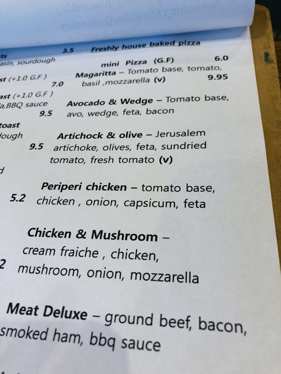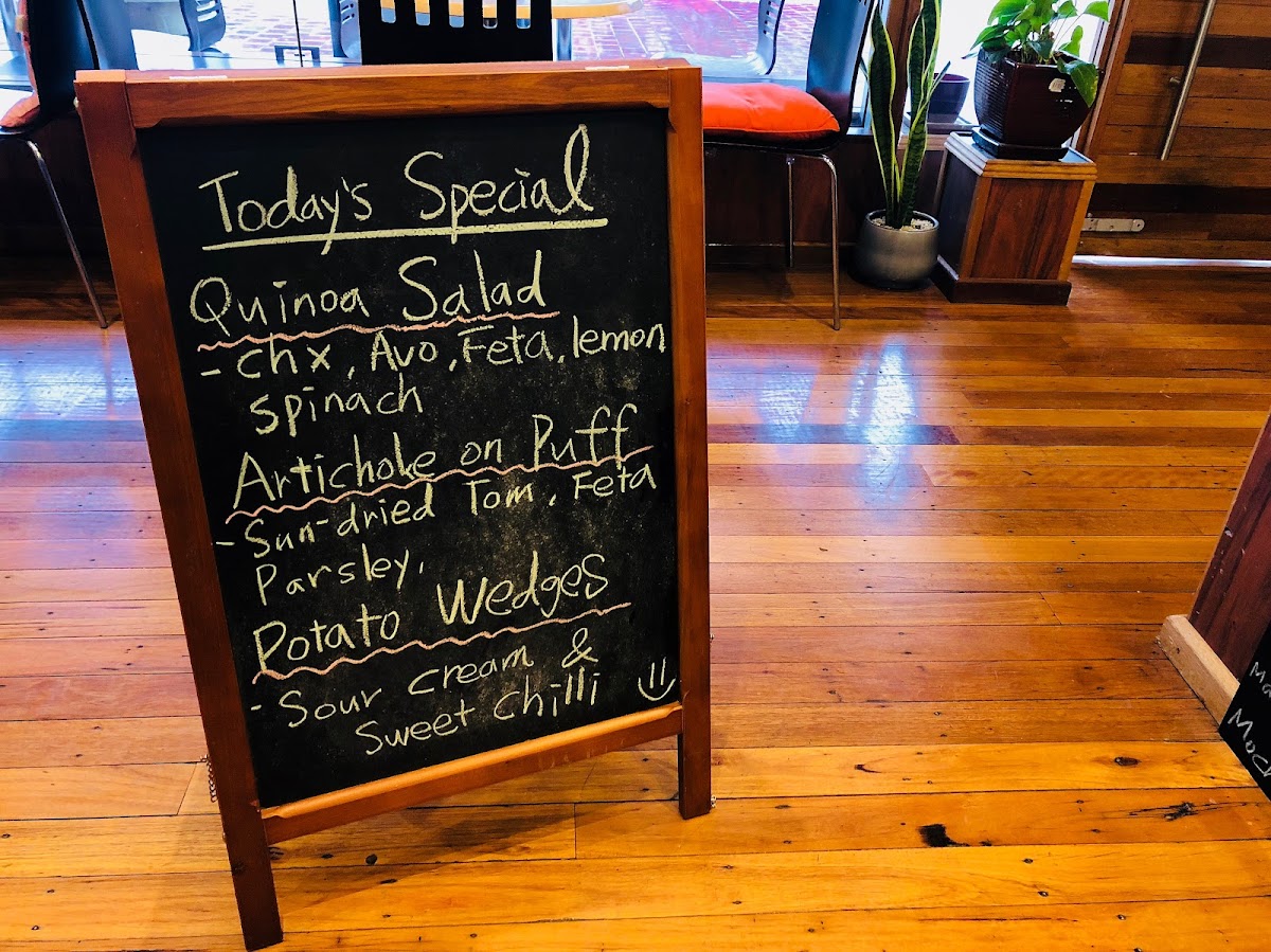 Food items include light breakfast dishes and brunch-style options, featuring choices like avocado on toast, poached eggs on toast with mushrooms, bruschetta, and chicken salad. There are also more substantial items available, such as a meat pie and daily specials which may vary.